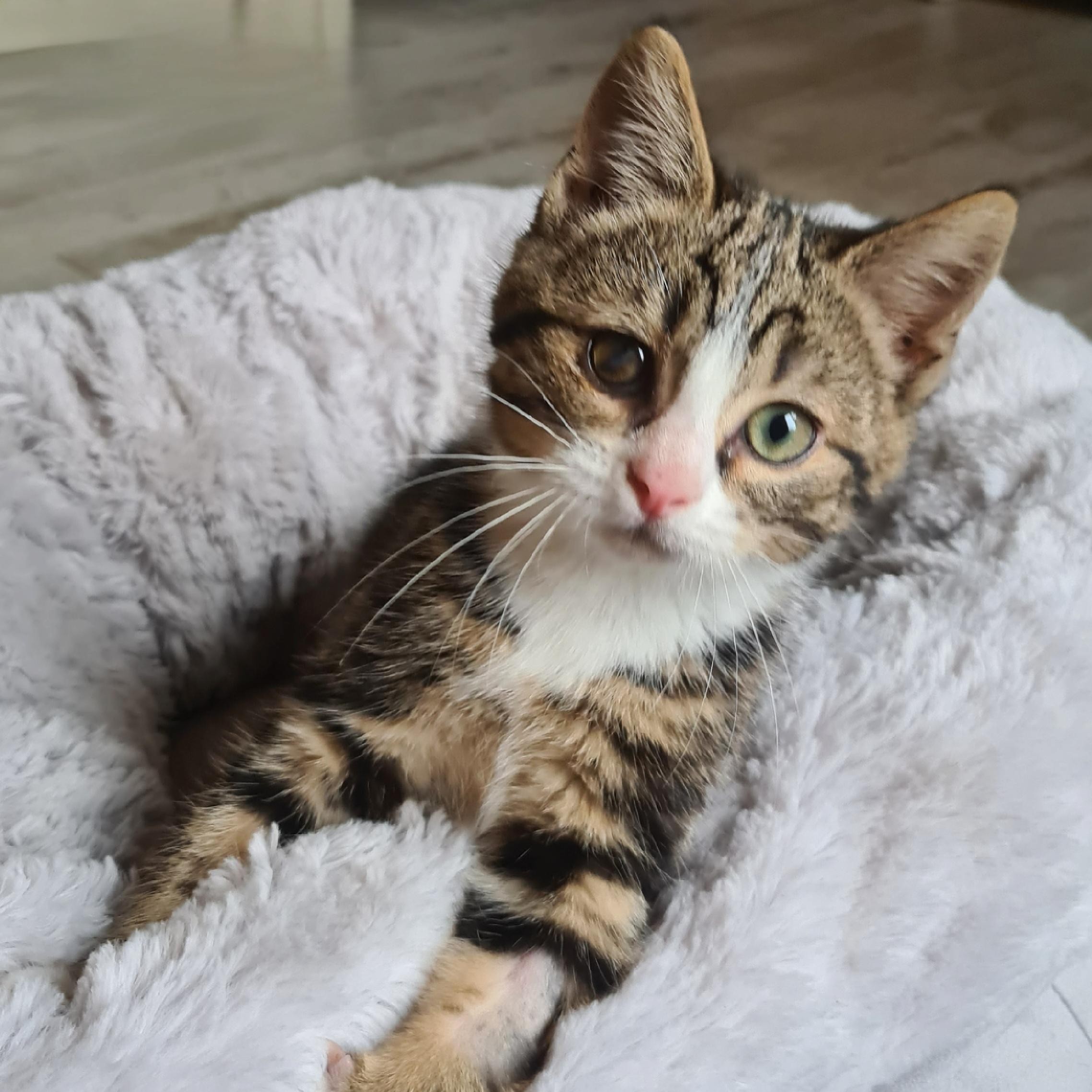 Victime de sa témérité, il a reçu un coup (de griffe certainement) entraînant un ulcère à son œil. Ulcère cicatrisé, ça ne se voit presque pas ( sauf en photo), et c’est sans conséquences sur sa qualité de vie.